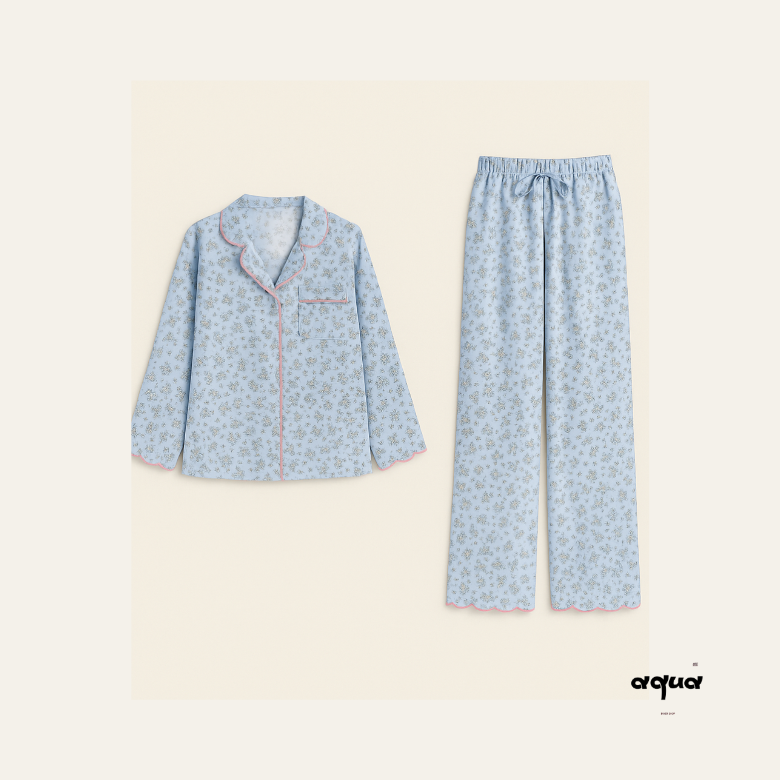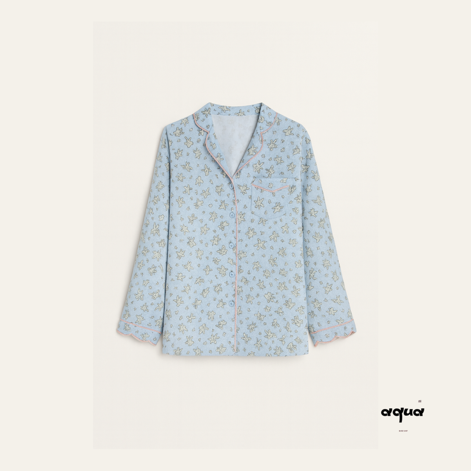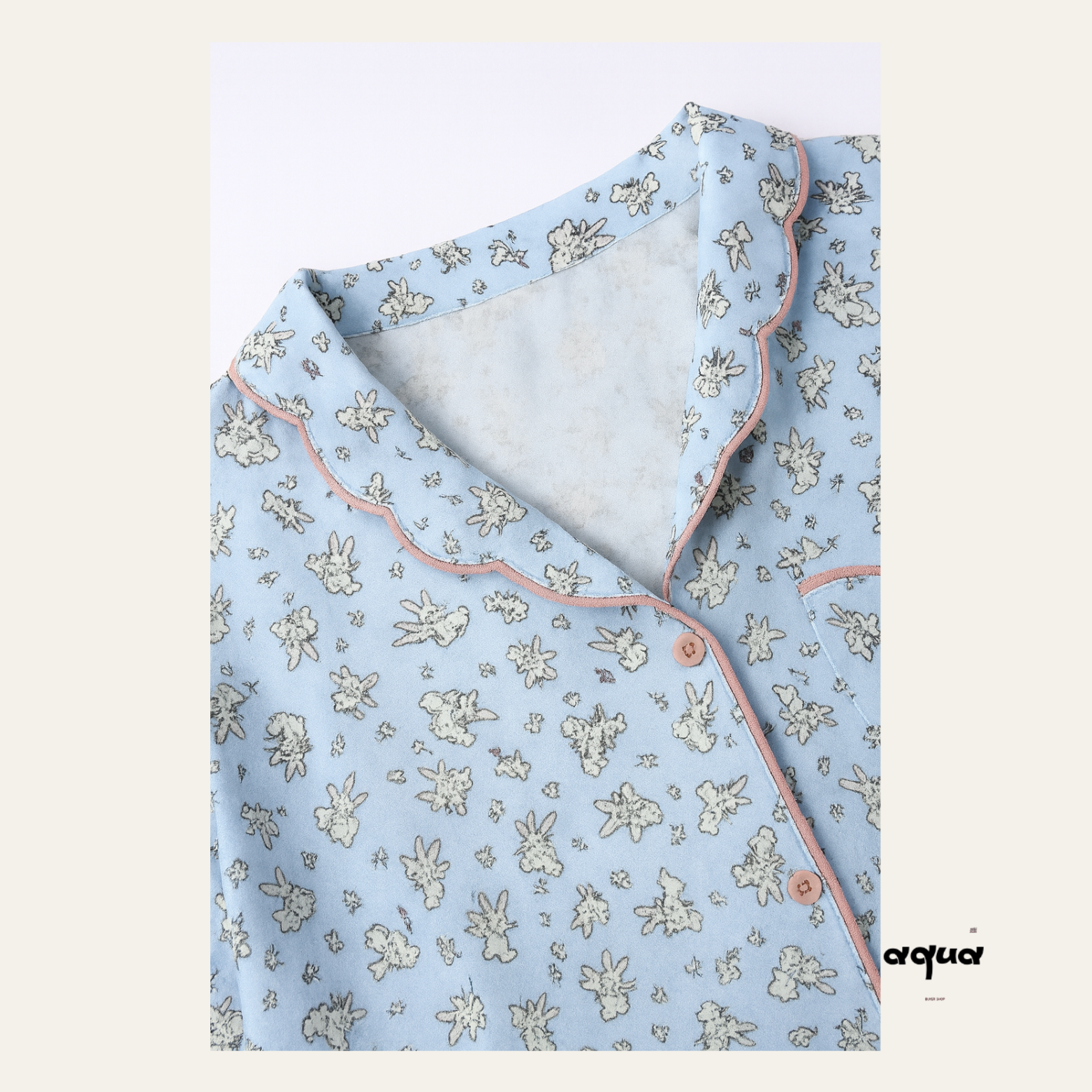 This little bunny print pajama set is made of soft and skin-friendly cotton and linen material, providing ultimate comfort. The light blue background color sets off a fresh and natural atmosphere, and the pink edge details add a gentle and sweet touch. The cuffs and trouser cuffs are designed in petal shapes, with exquisite details that add a touch of girlish charm. It is an ideal choice for those who pursue both comfort and cuteness.