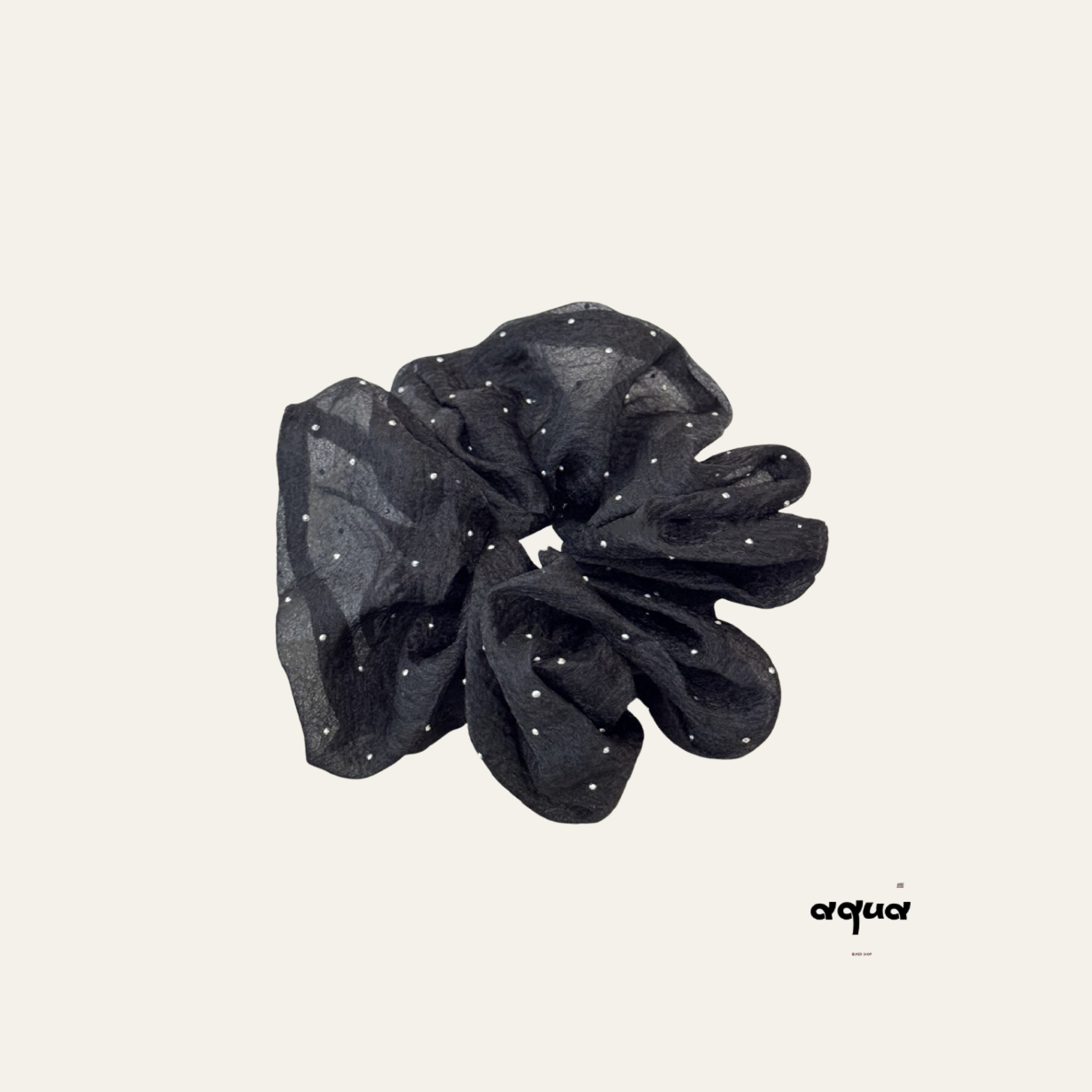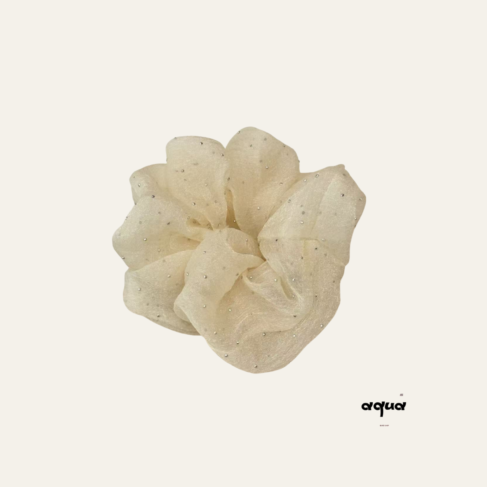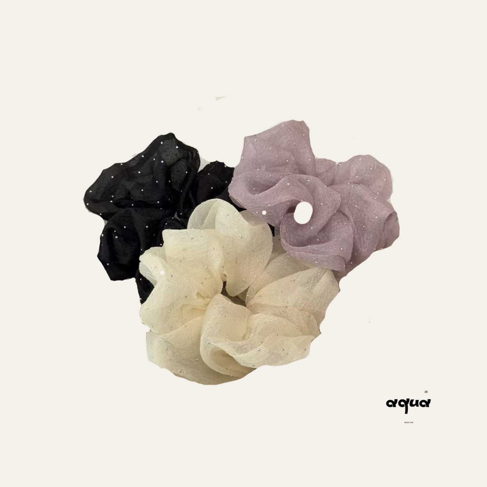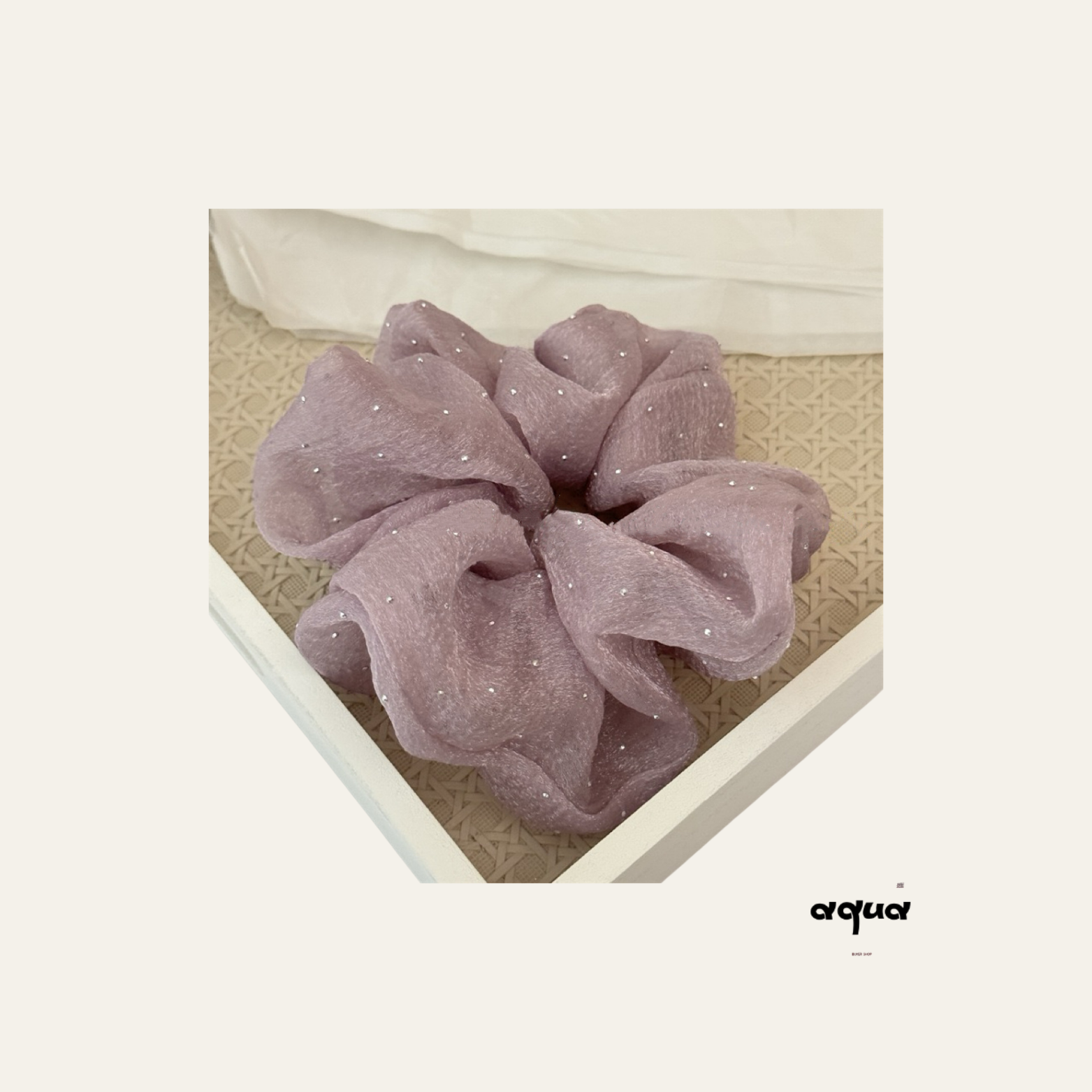 The set includes soft, plush-lined slippers with anti-slip soles for secure, cozy steps, and a delicate mesh scrunchie adorned with subtle sparkles, blending simplicity with refined style.
